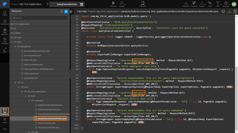 For each and every named query, there will be a rest service generated from query execution controller and exposed under APIDesigner panel. Here we are seeing two queries - EmpCountByState and which were created from the query editor.