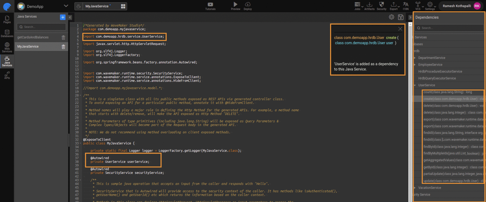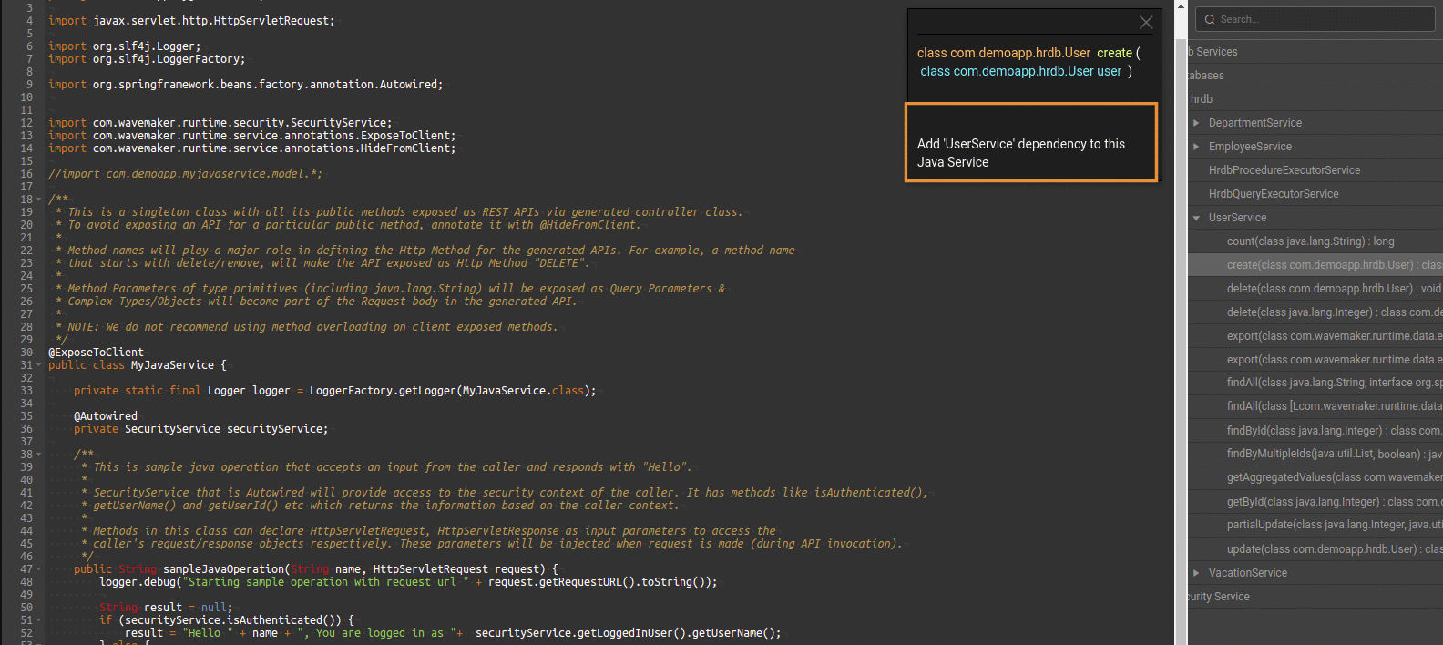 For working with the Database table operations such as insert, get, update in Java Service, from the dependencies dialogue select the service method and click on add particular service to this Java Service, so that the required import and autowired will be added we can make use of the autowired variable and call any of its methods