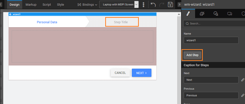 1. Adding More Steps to the Wizard: Add one more step – click on the wizard canvas and click on Add Step. Change Step Title to Professional Data by using the Title property of the step.