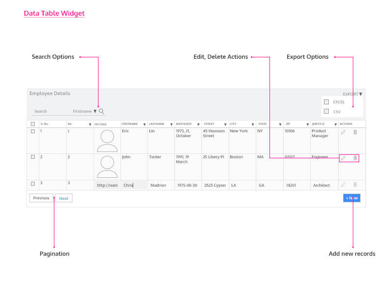 Data Table provides a tabular view for database Entities or API response data. Data Table can be bound to data sources like database tables, queries, procedures, web services or JSON objects through Variables.