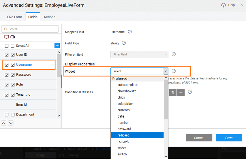 Widgets like select, autocomplete, radioset, checkboxset and switch can be used for various fields within Live Form. These widgets can be used to show the predefined options to the user.