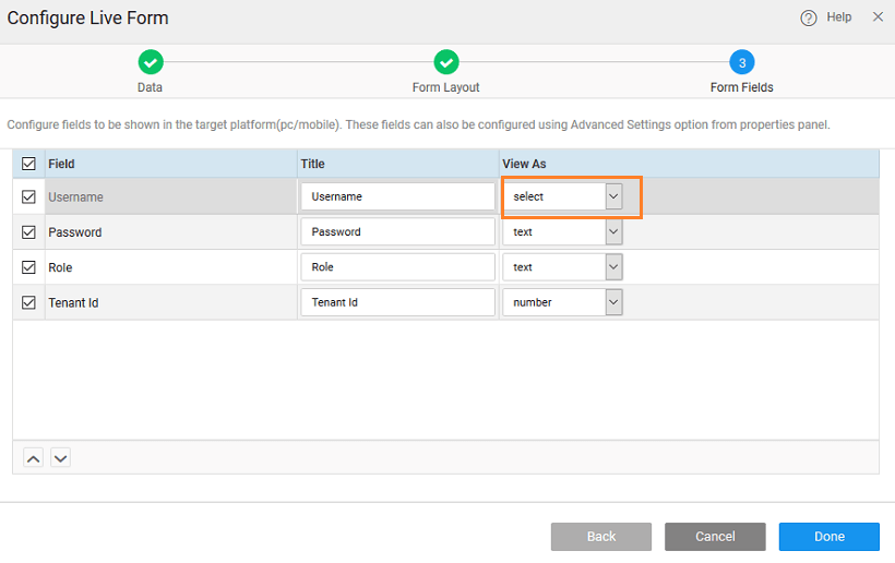 - specify the widget to be used to represent each data field. Based on the data type of the field, the available widget options would vary.