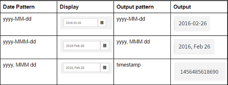 Output Format | Defines the format of output datavalue returned by the date widget. Default output format is 'yyyy-MM-dd', which returns the equivalent data value. E.g data value for '19/06/2015' is '2015-06-19'. If the output format is given as 'MMM dd, yyyy', widget returns datavalue as 'Jun 19, 2015'. |