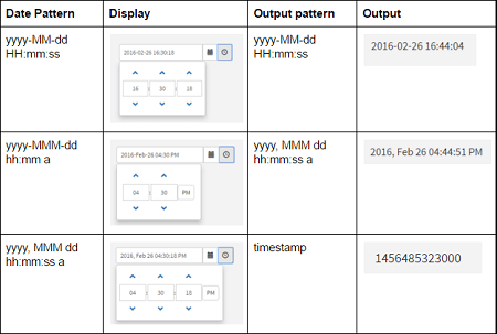 Output Format | Defines the format of output datavalue returned by the date time widget. Default output format is 'timestamp', which returns the equivalent timestamp integer. E.g timestamp value for '2012-12-12 12:12 PM' is '1355294520000'. If the output format is given as 'yyyy-MM-dd hh:mm a', widget returns datavalue as '2012-12-12 12:12 PM'. |