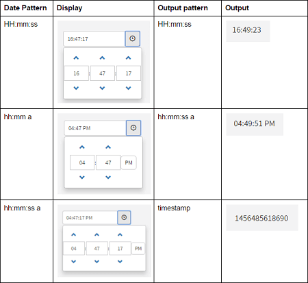 For Time and Datetime widgets the time picker UI based on the time pattern given. For example, if the pattern is ‘hh:mm:ss a’, seconds and AM/PM pattern is displayed in time picker. If the pattern is ‘HH:mm’, 24Hr format is shown. Seconds and AM/PM are not displayed in time picker.