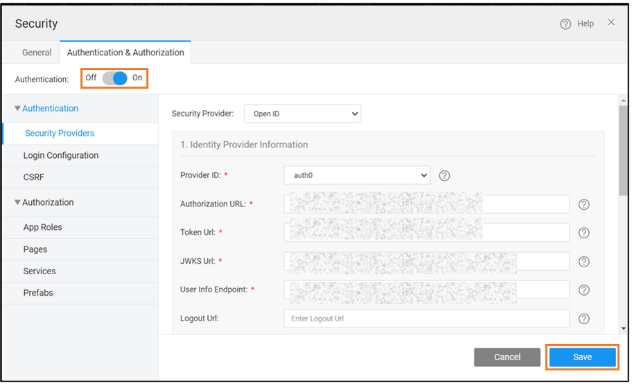 - Go to the Authentication and Authorization tab to enable the primary security provider. Click Save.