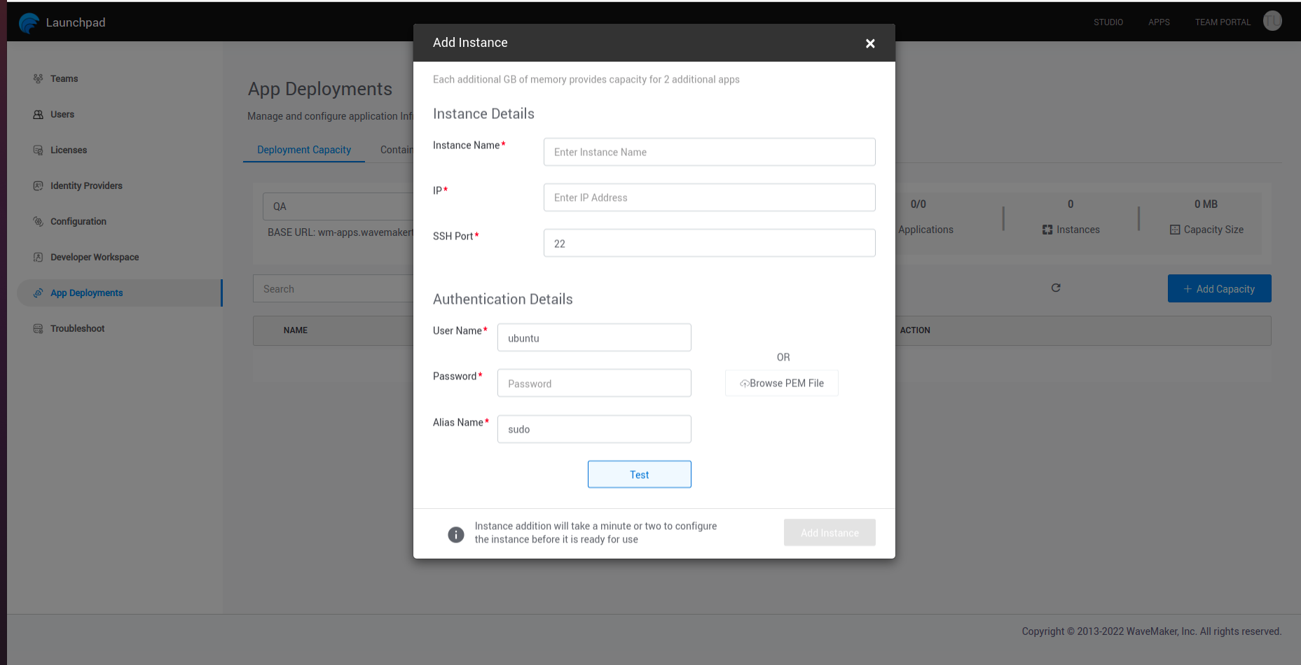 - Select App Deployments section and at deployment capacity select add capacity for adding an Instance to deployment capacity.if Instance not created launch instance with required prerequisites